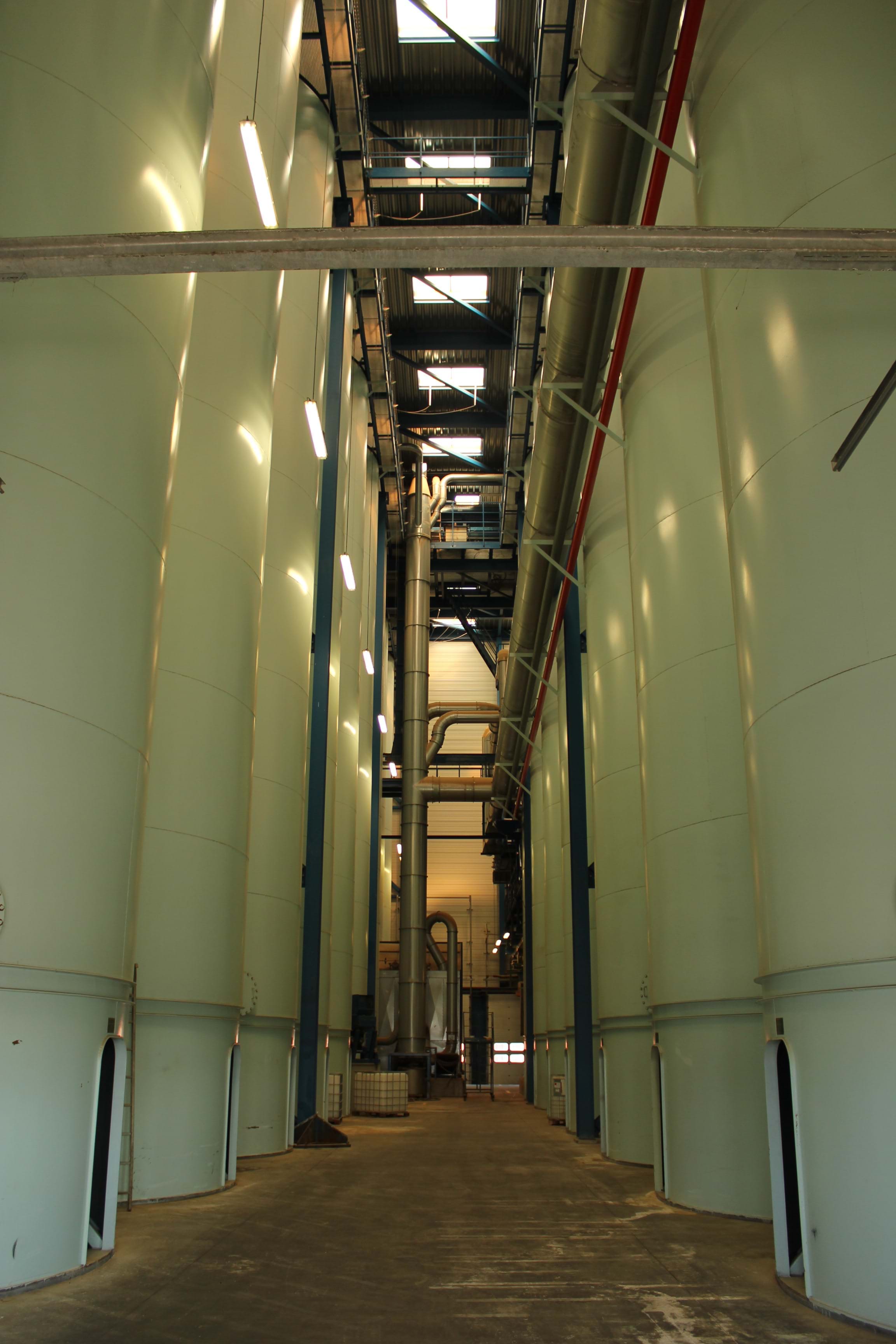 Eighteen 400 m3 storage tanks for fish meal. All tanks are slightly conical with conic bottoms for meal outlet machinery.