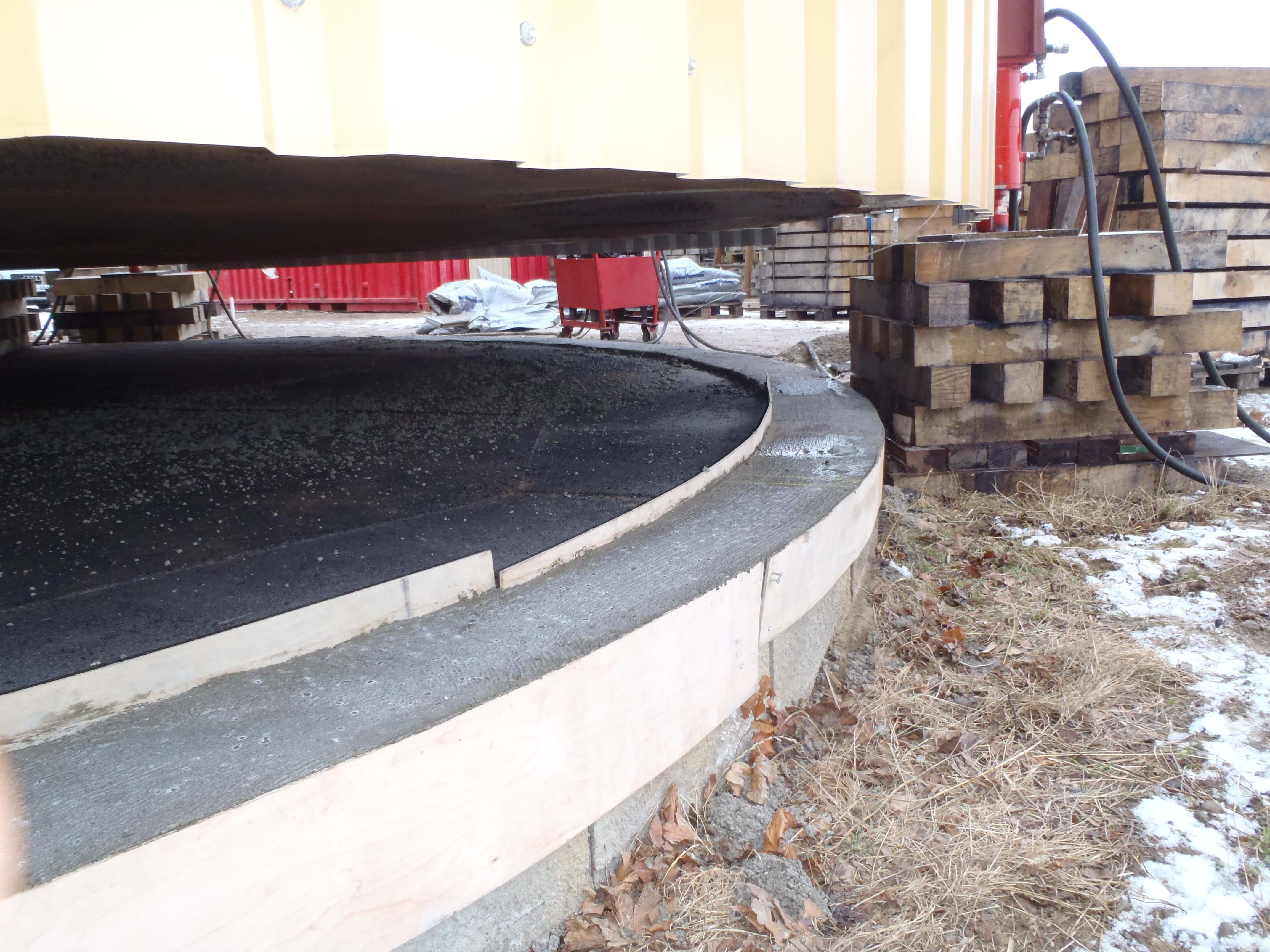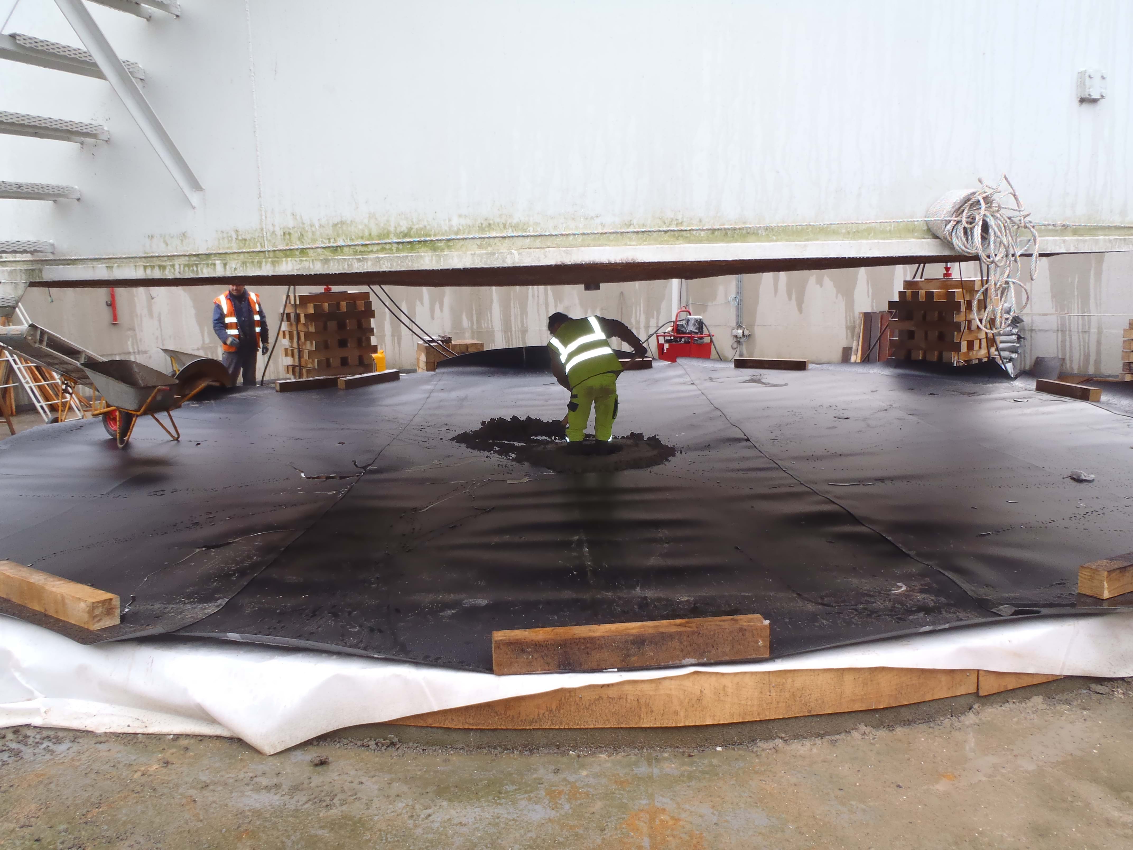 Laying HDPE geomembrane under existing storage tank to create secondary barrier.